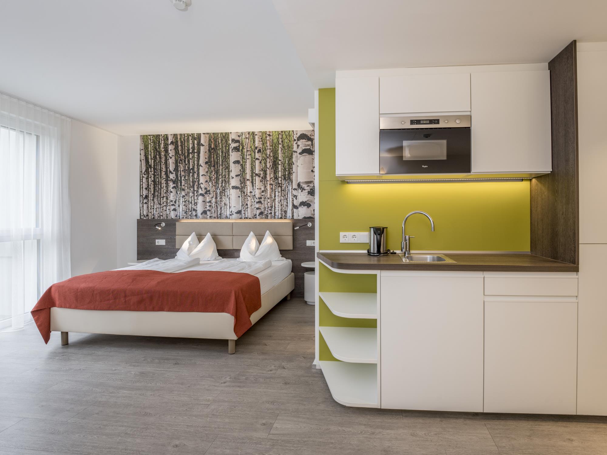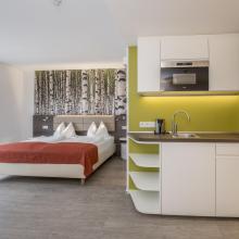 The rooms are defined by generous space and contemporary living comfort. Each room features a modern bathroom with a separate WC, a kitchenette, flat-screen TV, Wi-Fi, and a cozy seating area for both work and relaxation.
